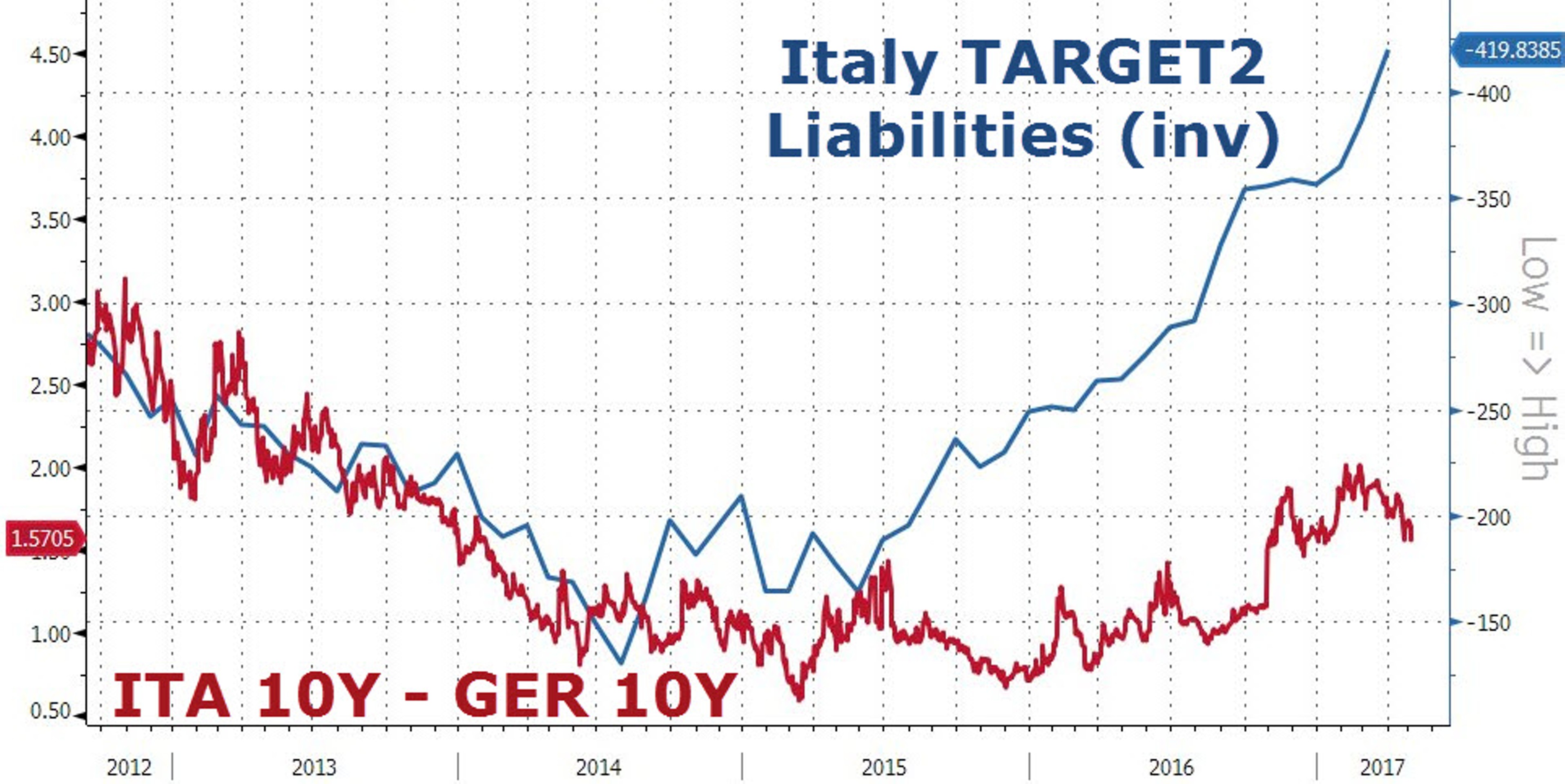 Потеря $100 млрд обернется ударом для крупных иностранных банковских инвесторов, а не покупкой итальянских облигаций ЕЦБ. Фактически выпуск иностранных банков связан с вмешательством ЕЦБ, потому что он имеет возможность продавать значительную часть своих итальянских государственных облигаций. Неслучайно госдолг, проводимый за рубеж, снизился на 42 млрд евро только за первые девять месяцев 2016 г. Нашествие ЕЦБ на рынке и уход иностранных банков, таким образом, две стороны одной медали. Результатом является то, что итальянская финансовая стабильность все больше и больше зависит от поддержки международного института, которая в следующем году почти наверняка прекратится.