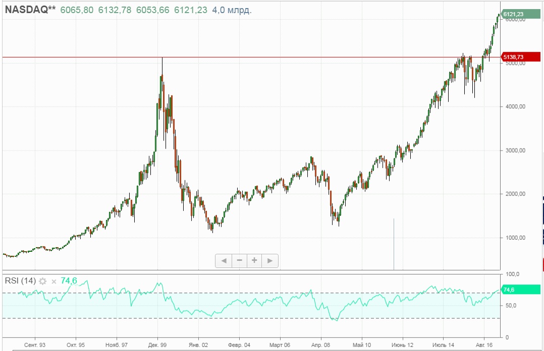 Но пока этого нет, пусть даже продолжающиеся «карабканья в небеса» индекса NASDAQ вызывают кроме удивления и восхищения повышенную настороженность. Индекс NASDAQ уже давно преодолел уровни максимумов 2000 года. По ТА индекс нарисовал фигуру «чашка с ручкой» и по ней уже отработал первые цели движения. Рост индекса NASDAQ за последний год вызывает все большее беспокойство, да и индекс RSI по нему вновь находится в зоне перекупленности. Впрочем, напомним, что перед коррекцией 2015 года он находился в зоне перекупленности более года. А перед провалом начала века находился в этой тревожной зоне около 5 лет. Так что ТА в опасениях за самочувствие фондового рынка США является довольно посредственным помощником. А вот реальные события вполне могут послужить толчком к тому, чтобы внести поправки во вновь развивающуюся в NASDAQ болезнь гипер- оптимизма. В этих условиях кому-то проще отложить ТА и разного рода высоколобые или панические размышления и просто постоять в стороне, дождавшись либо сильных событий, либо более внятных сигналов уже от самого рынка.