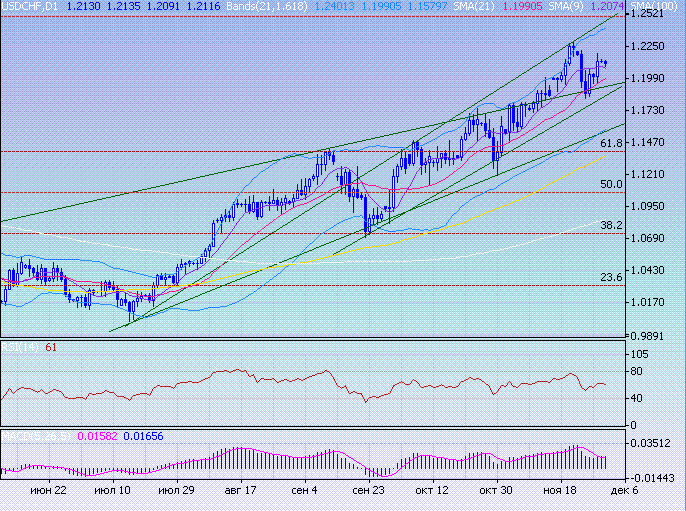 В текущую сессию ожидаем роста свисси, прорыв 1,2150 наверх приведет к росту доллара к верхним отметкам. Цель: 1,1995