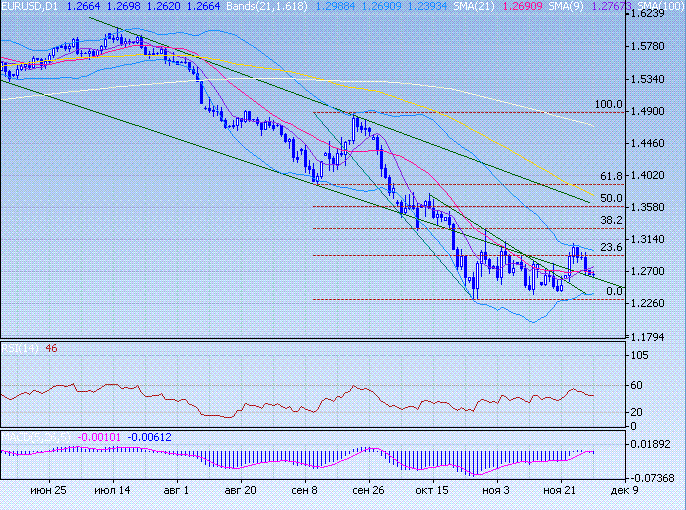 Прошедшая неделя не внесла сюрпризов, евро предпринял неудачные попытки к росту, затем откатился в середину полосы Боллинжера. Пара торгуется по поддержке среднесрочного канала. Ситуация нейтральна, вероятно пара формирует основание. В ближайшие сессии ожидаем консолидации, пара будет определяться с направлением дальнейшего движения, торгуясь в диапазоне 1,3020-1,2450.