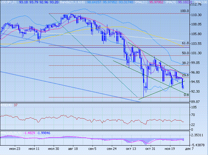 Период низкой волатильности привел к сильному движению. Йена подросла, преодолев поддержку среднесрочного треугольника. Поддержку доллару оказали отметки в районе 93,20. Среднесрочный целевой ориентир находится в районе 85,00. В случае развития тенденции йена продолжит рост к целевым отметкам. Определяющими станут поддержки на 92,00 и в районе 91,00. На фоне перепроданности краткосрочных индикаторов и торговле по нижней границе полосы Боллинжера вероятен откат к верхним отметкам.