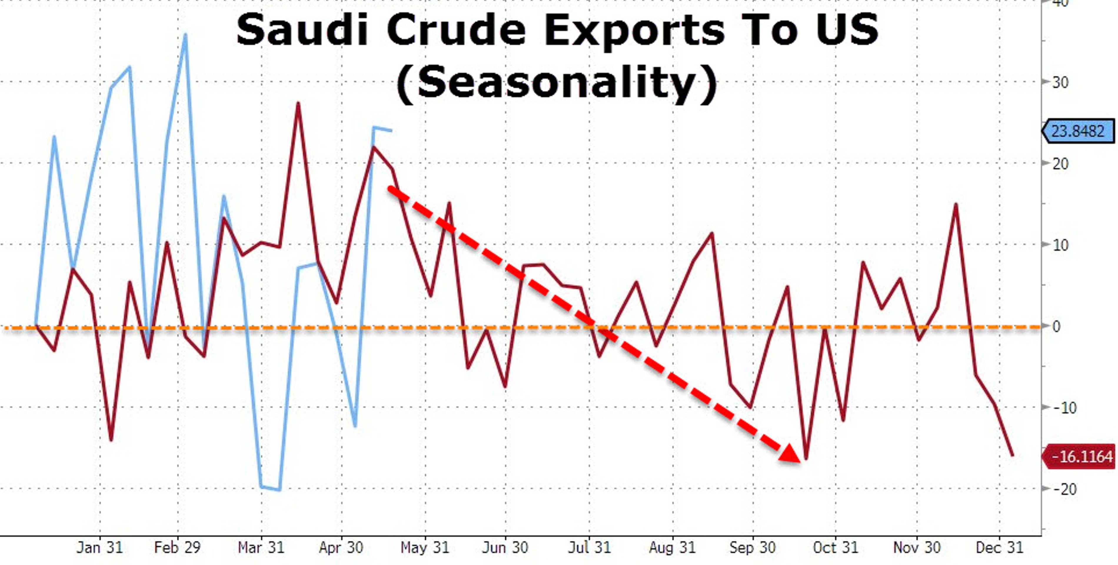 Вопрос, конечно же, спорный. К тому же очень похоже, что это скорее словесная интервенция, ведь саудиты и так в летний сезон, как правило, поставляют в Штаты меньше нефти. Ниже приведен график сезонных поставок.