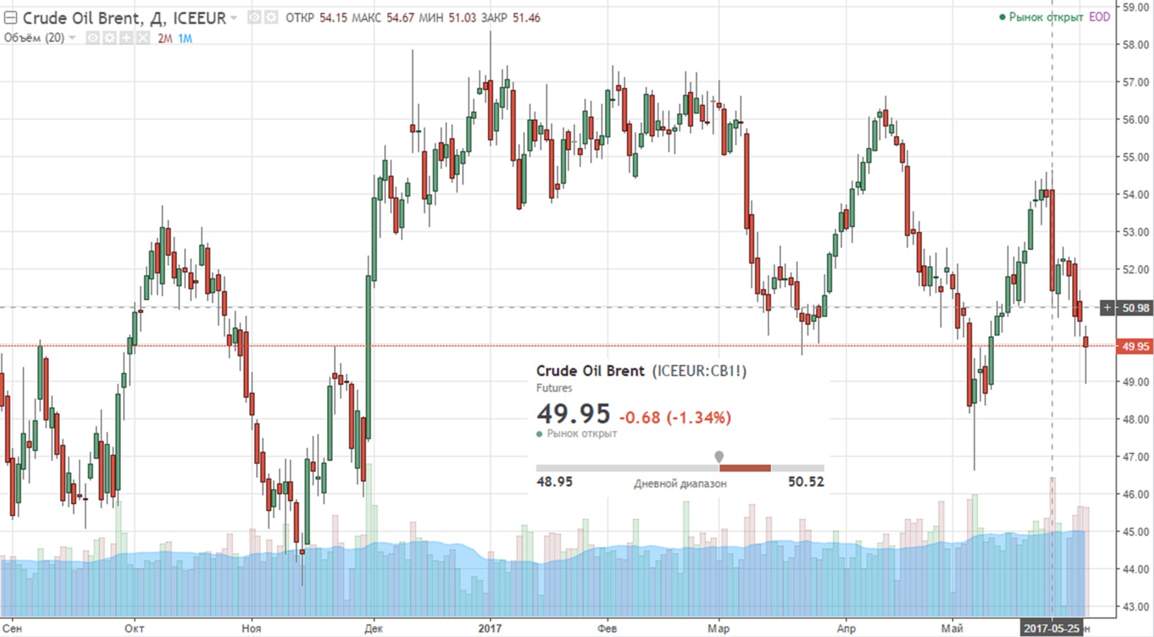 Цена Brent после роста на 1,5% до $ 50,64 за баррель к 9:00 мск перешла к снижению, и баррель нефти европейского эталона к 16:00 мск уже стоил $49,95, теряя 1,34% стоимости к закрытию предыдущих торгов.