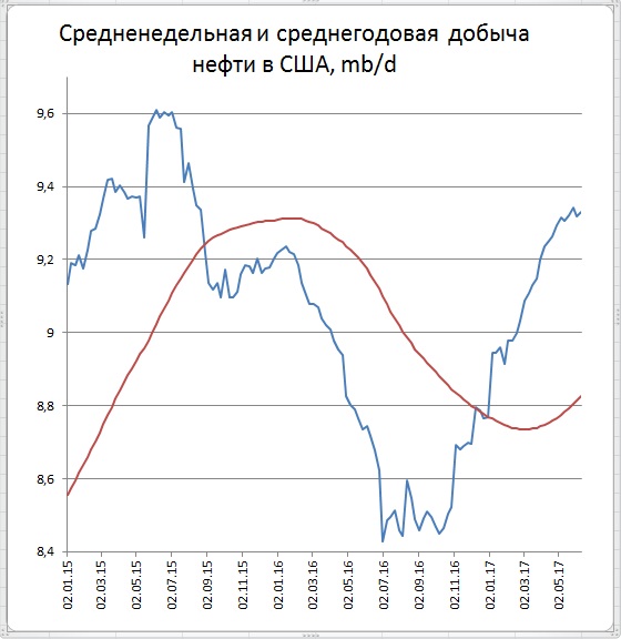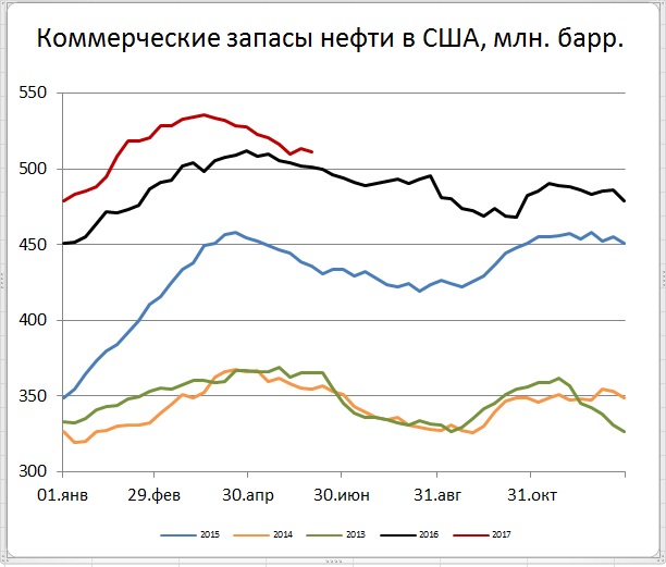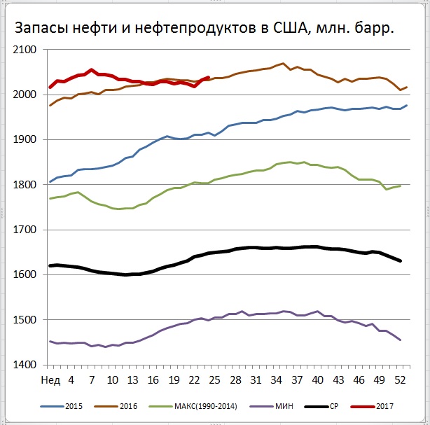 EIA сообщило, что за неделю, закончившуюся 9 июня 2017 года, коммерческие запасы нефти в США сократились на 1,661 (до 511,546 с 513,207 mb неделей ранее). Как видим, тренд на снижение запасов еще борется за свое продолжение. Это стало значительным разочарованием для людей, поверивших оценкам API, согласно которым запасы нефти на прошлой неделе выросли на 2,75 млн. mb. Теперь до кривой запасов предыдущего года вновь остается минимальное расстояние, и возможное его преодоление стало бы серьезным разочарованием для апологетов всесилия сланцевой добычи.