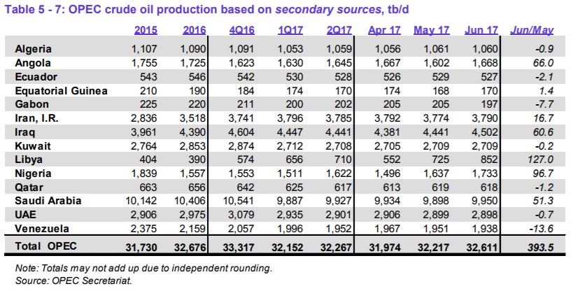 Взаимоотношения в ОПЕК+ в настоящее время проходят серьезное испытание на прочность. Новостью прошедшего дня на рынке нефти стали известия о растущем расколе в рядах ОПЕК+. На этот раз по поводу приезда представителей Ливии и Нигерии на намеченное 24 июля заседание наблюдательного комитета ОПЕК+. Напомним, что именно эти страны были освобождены от соглашений по ограничению добычи. И как раз они в последнее время показывали сильный рост объемов добычи нефти. Так, Ливия нарастила добычу с 0,39 mb/d в 2016 году до 0,852 mb/d в июне 2017 года. Нигерия в 2016 году добывала 1,557 mb/d, а в июне этот показатель вырос до 1,733 mb/d.