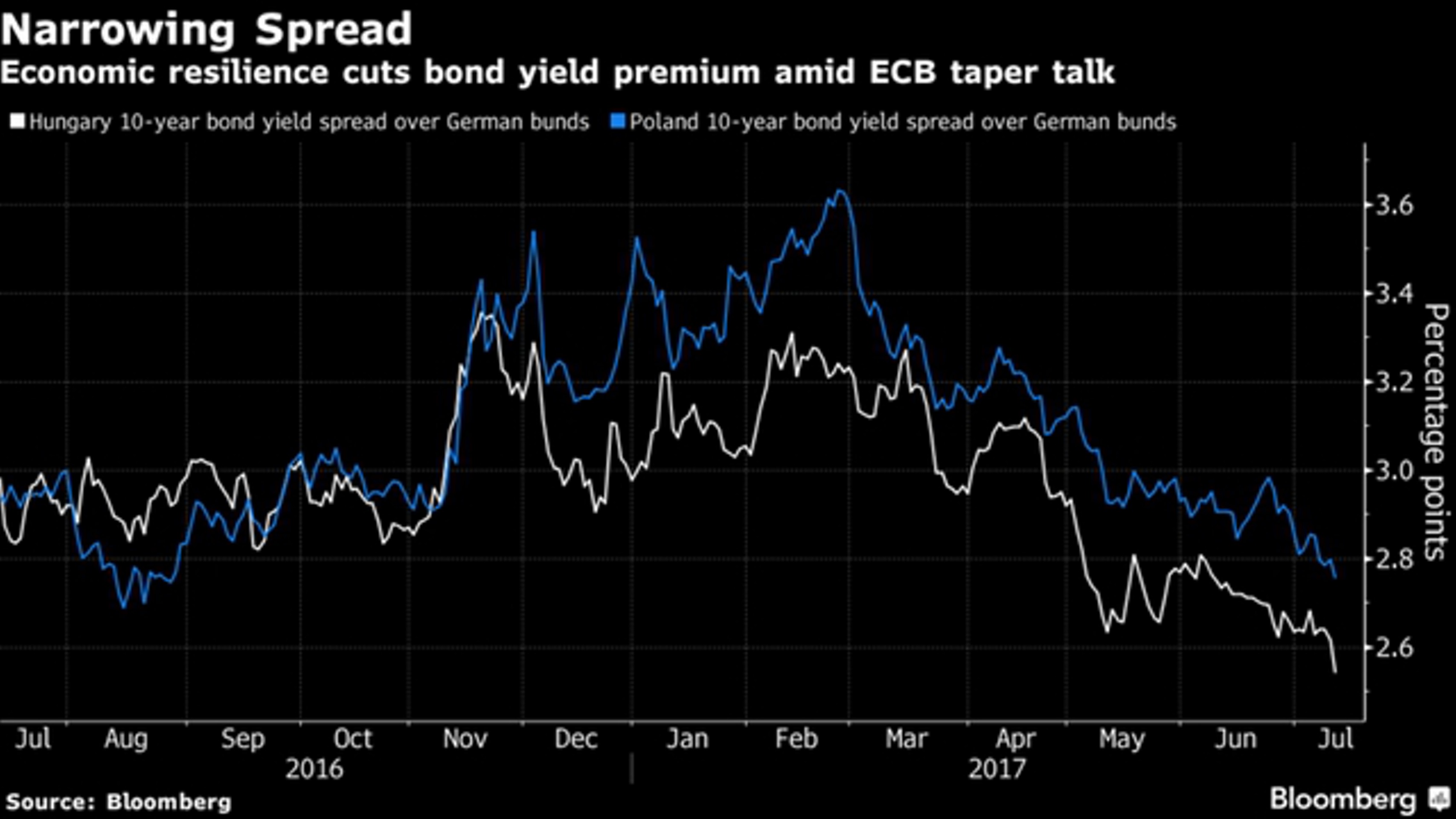 В этом месяце цены на облигации стран от Польши до Венгрии в национальной валюте выросли на фоне усиления опасений по поводу того, что ЕЦБ готовится к сокращению беспрецедентных стимулов. Бонды региона принесли инвесторам во II квартале 6,7%, что является лучшим показателем среди развивающихся рынков.