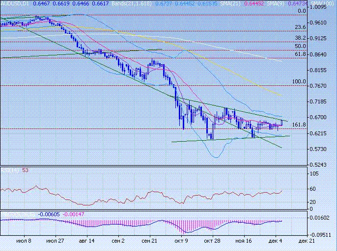 Аусси предпринял неудачную попытку преодолеть сопротивление треугольника (0,6660), затем откатился. Индикаторы указывают на перекупленность, следует ожидать отката вниз затем возобновления попыток прорыва сопротивления. Прорыв поддержки треугольника (0,6132) приведет к снижению аусси в район 0,5880.