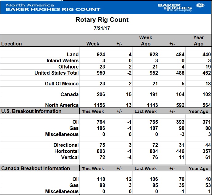 Вышла свежая порция данных от компании Baker Hughes по буровой активности на 21 июля. Количество активных буровых на нефть в США за неделю снизилось на 1 шт.