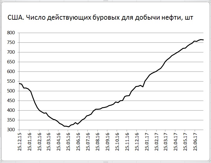 В масштабах произошедшего роста снижение на 1 шт. выглядит микроскопически незаметным. Напомним, что от минимумов (316 шт.) число буровых выросло на 448 шт. Тем не менее, это пусть и небольшое, но снижение, которое дает минимальную надежду, что в будущем тренд на рост будет приостановлен.