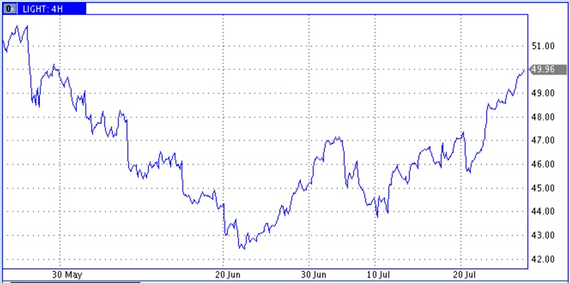 Мировые цены на нефть растут в понедельник утром; нефть марки WTI впервые с 30 мая поднялась выше психологической отметки в 50 долларов за баррель, свидетельствуют данные торгов.