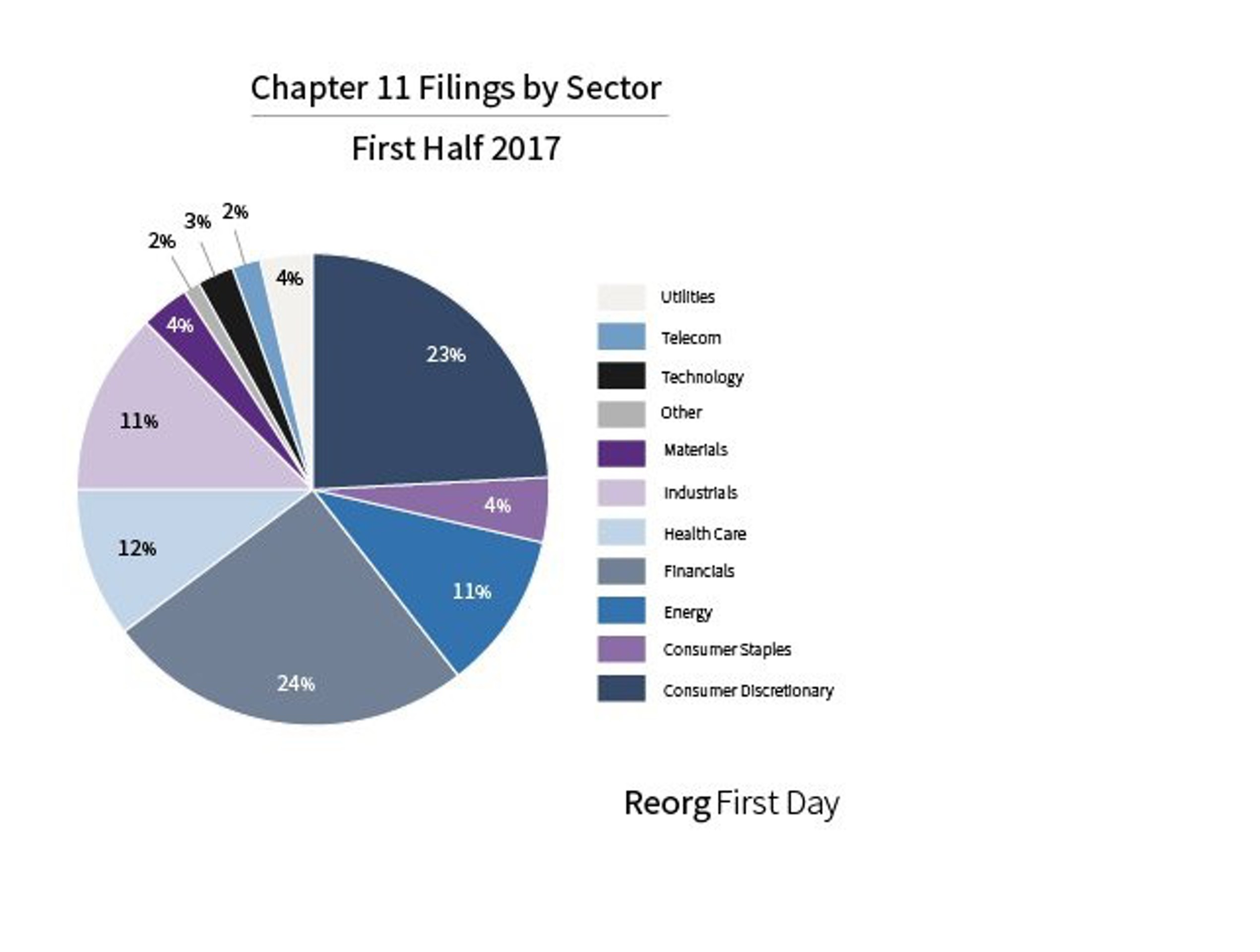 Если в первой половине прошлого года лидерам по количеству банкротств были компании энергетического сектора - преимущественно сланцевые компании: на них приходился 21% дефолтов, то в по итогам первого полугодия 2017 г. лидерами являются финансовые компании и сектор ритейла.