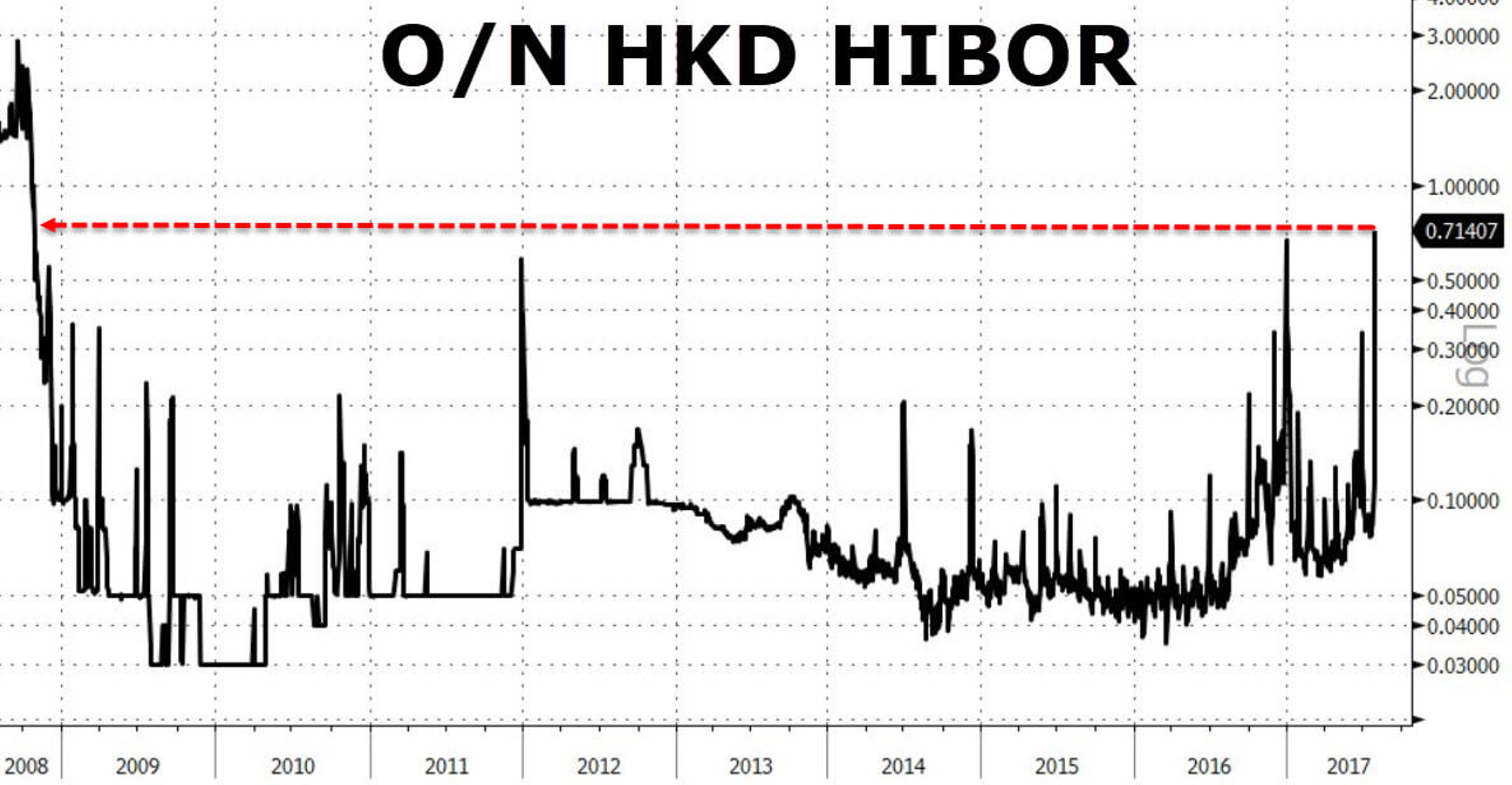 Итак, ставка овернайт в Гонконге достигла максимума с 2008 г., причем, если проследить историю, до настоящего времени резкий рост ставок происходил только в конце года, но сейчас совсем другое время года. Ставка HKD Hibor овернайт взлетела более чем на 60 б. п. и достигла отметки 0,71407%.