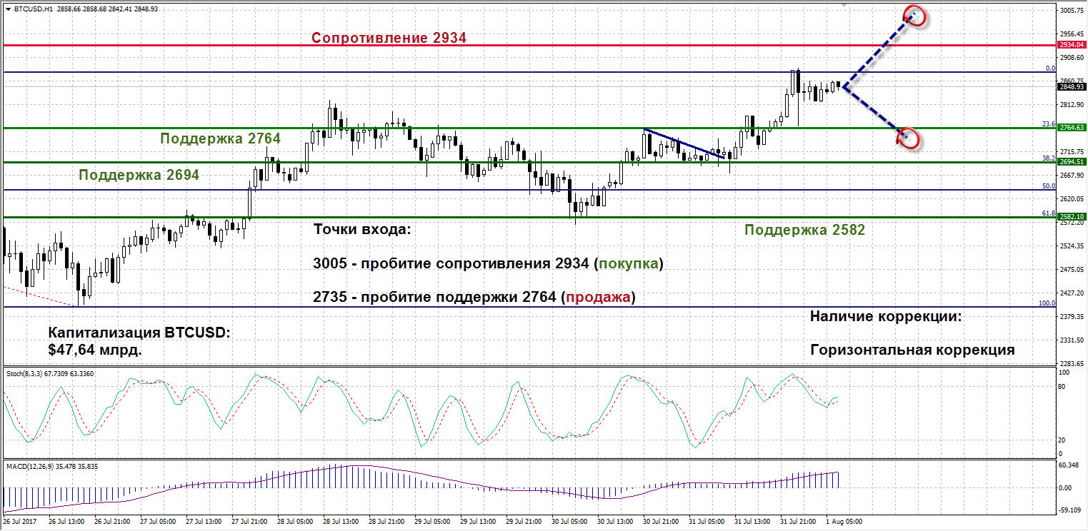BTCUSD: Сегодня очень важный день в торговле Биткоином. Назначенный на 1 августа хардфорк криптовалюты с запуском альтернативного Bitcoin Cash вызывает неоднозначную реакцию у участников рынка. Несмотря на это, капитализация актива выросла сегодня до отметки $47,64 млрд. Технические индикаторы не дают подсказок. Стохастик, выйдя из зоны перекупленности, расположился в нейтральной зоне. MACD вырос на восходящих барах. Перед хардфорком Биткоин приблизился к абсолютным максимумам. Если под влиянием хардфорка произойдет отскок или пробитие, это можно рассматривать, как достаточно сильный сигнал для входа в позиции. На пробитии сопротивления 2934 начинаем набирать лонги по цене от 3005, в короткие позиции входим, если хардфорк вызовет обрушение котировок криптовалюты. Начинаем с отметки 2735 при пробитии поддержки 2764.