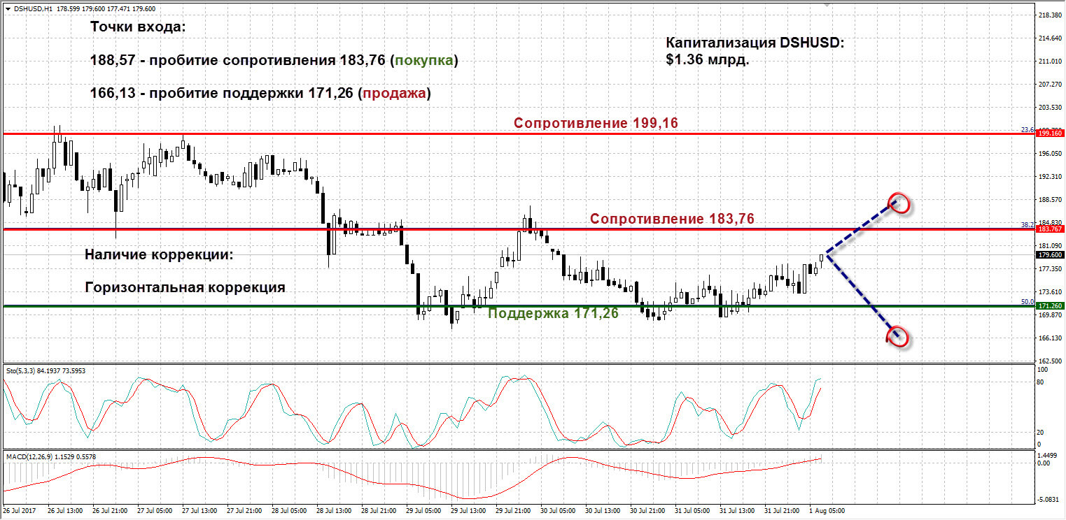 DSHUSD: Дашкоин, как и другие основные криптовалюты, увеличился в капитализации до отметки $1,36 млрд. Актив отскочил от уровня поддержки 171,26. Если быки смогут пробить сопротивление 183,76, заходим в лонги по цене от 188,57. Короткие позиции занимаем, начиная с отметки 166,13 при пробитии поддержки 171, 26. Технические индикаторы четких сигналов не дают. MACD на восходящих барах пробил снизу вверх нулевую отметку. Стохастик пытается войти в зону перекупленности.
