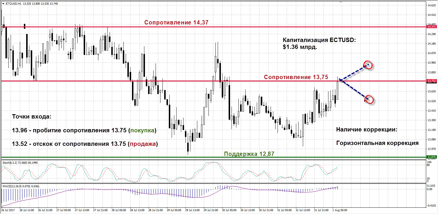 ETCUSD: Хардфорк может заставить пользователей криптовалют вывести средства из Биткоина в другие активы, в том числе Эфириум Классик. Эфириум также в свое время подвергся разделению на 2 валюты, ETH и ETC, но благодаря относительной молодости криптовалюты отделение было достаточно безболезненным. В зависимости от развития событий транзакции по Биткоину могут быть заблокированы сегодня, но хардфорк может повлиять и на другие основные криптовалюты, давая трейдерам возможность заработать на волатильности после его проведения. Эфириум Классик дорос до уровня сопротивления 13,75. В случае пробития входим в лонги по цене от 13,96. Продаем при отскоке, начиная с отметки 13,52.