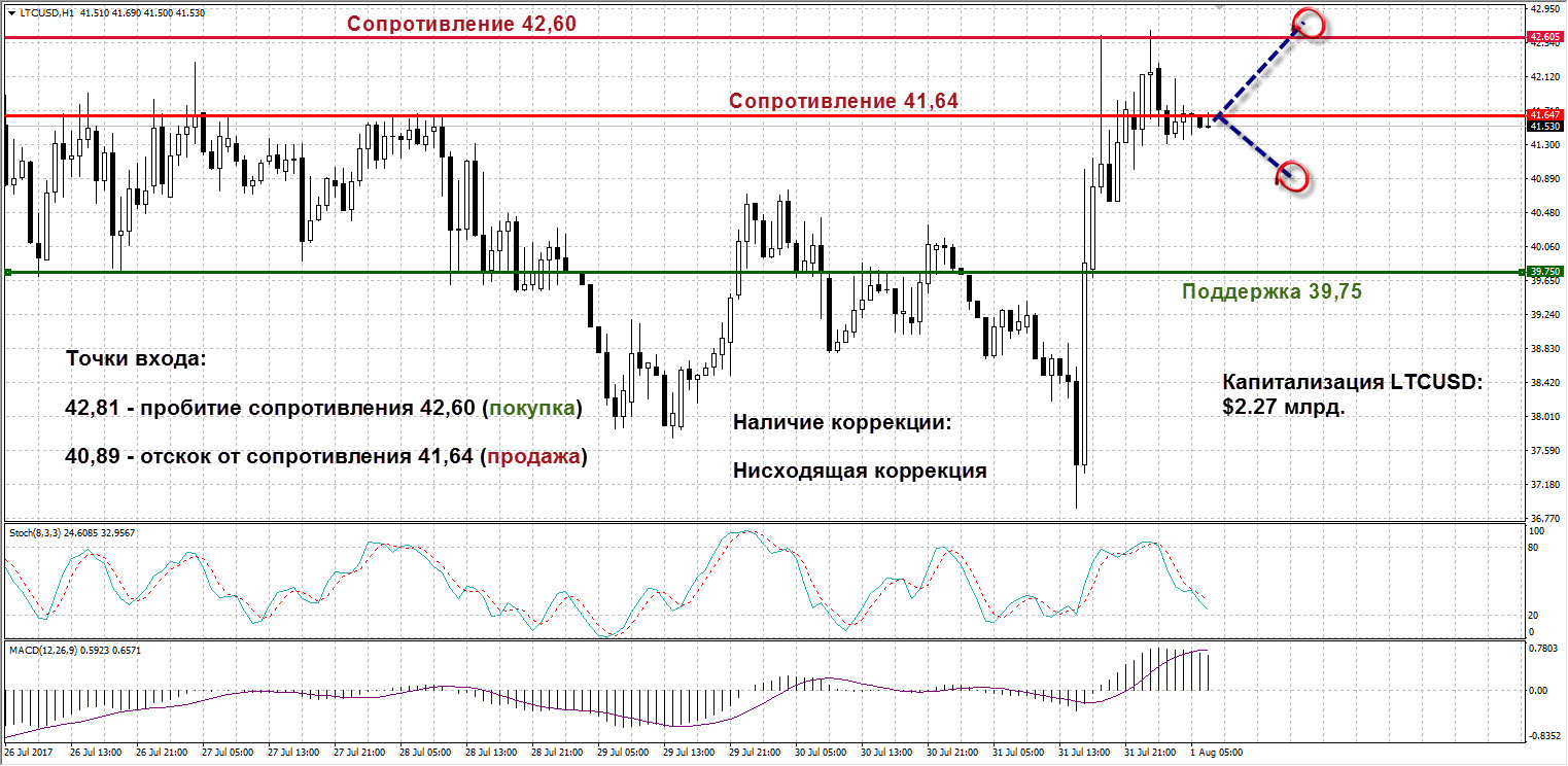 LTCUSD: Активный рост Лаиткоина остановился только на сопротивлении 42,60. Если повторное тестирование этого уровня окажется удачным, покупаем актив по цене от 42,81. В шорты заходим при отскоке от сопротивления 41,64, начиная с отметки 40,89. Стохастик вышел из зоны перекупленности, линия индикатора направлена вниз. MACD, подросший на растущих барах, немного снизился на коррекции. Капитализация актива выросла сегодня, составив $2,27 млрд.