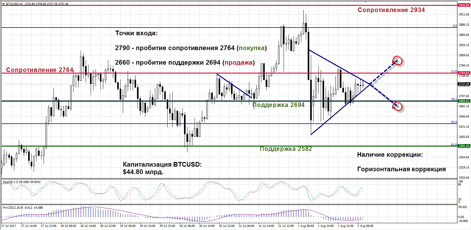 BTCUSD: Назначенный на 1 августа хардфорк основной мировой криптовалюты прошел успешно. Теперь помимо привычного Биткоина существует Биткоин Кэш (BCC). Как и ожидалось, Биткоин на фоне разделения на две криптовалюты отскочил от максимумов и просел в цене. Капитализация актива упала до отметки $44.80 млрд. В последние часы криптовалюта торгуется в пределах сходящегося треугольника. Пробой верхней границы фигуры и сопротивления 2764 можно считать сигналом для покупок по цене от 2790. В шорты заходим, начиная с отметки 2660 при выходе из треугольника вниз и пробитии поддержки 2694. Технические индикаторы пока не подают сигналов. Стохастик движется в нейтральной зоне, линия индикатора направлена вверх. MACD снизился на нисходящих барах.