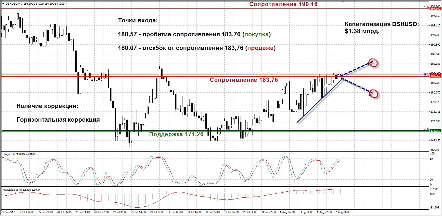 DSHUSD: Быки по Дашкоину продолжают тестировать уровень сопротивления 183,76, образовав под ним сужающийся треугольник. При пробитии сопротивления 186,76 вверх заходим в лонги, начиная с отметки 188,57. Шорты берем по цене от 180,07 в случае отскока от уровня 183,76. Технические индикаторы четких сигналов не дают. Капитализация Дашкоина незначительно увеличилась до уровня $1,38 млрд.
