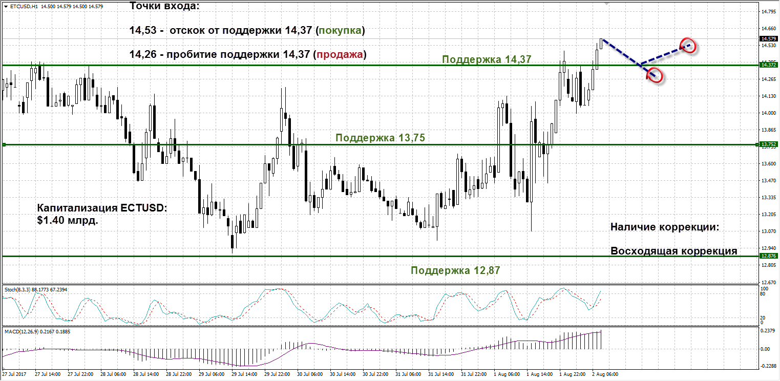 ETCUSD: Эфириум Классик в день хардфорка Биткоина показал достаточно уверенный рост, пробив вверх ценовой уровень 14,37. Теперь он является сильной поддержкой. Если при ее тестировании котировки отскочат от 14,37, пользуемся возможностью наращивать лонги по цене от 14,53. При пробитии поддержки 14,37 занимаем короткие позиции, начиная с отметки 14,26. На возможность нисходящей коррекции указывает Стохастик, входящий в зону перекупленности. MACD подрос на восходящих барах. Капитализация классического Эфириума выросла до $1,40 млрд.