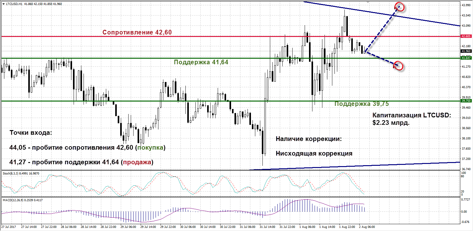 LTCUSD: В Лайткоине образовался крупный треугольник на дневном графике. Пробой этой фигуры можно рассматривать, как сильный и долгосрочный технический сигнал. В данный момент криптовалюта начала нисходящую коррекцию от верхней границы фигуры. В случае дальнейшего движения вниз заходим в шорты по цене от 41,27, закрывая их в диапазоне от поддержки 39,75 от нижней границы треугольника. Если будет пробита верхняя граница, занимаем лонги, начиная с отметки 42,60. Стохастик вошел в зону перепроданности, что указывает на недооцененность актива и возможность разворота вверх уже от поддержки 41,64. Капитализация Лайткоина достигла $2,23 млрд.