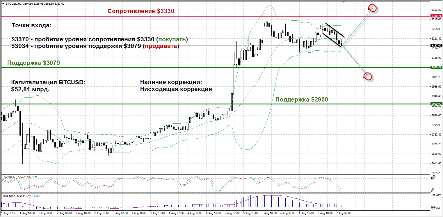 BTCUSD: Цена Биткоина отрицательно корректируется после значительного роста в прошедшие выходные. Быки пробили психологическую отметку $3000 и направили цену к локальному максимуму $3330, в случае пробития которого, можно пробовать открывать длинные позиции с уровня $3370. Капитализация, тем временем, выросла до $52,81 млрд., что является одним из самых высоких значений за последнее время. Индикатор MACD выше нулевой отметки при растущих вверх барах, а линия Стохастик за границей зоны перепроданности (5,67%), что дает слабый сигнал на покупку. Полосы Боллинджера характеризуют умеренную волатильность актива. В случае снижения котировок, рекомендуем продавать BTC с отметки $3034 после пробития ближайшей поддержки $3079.