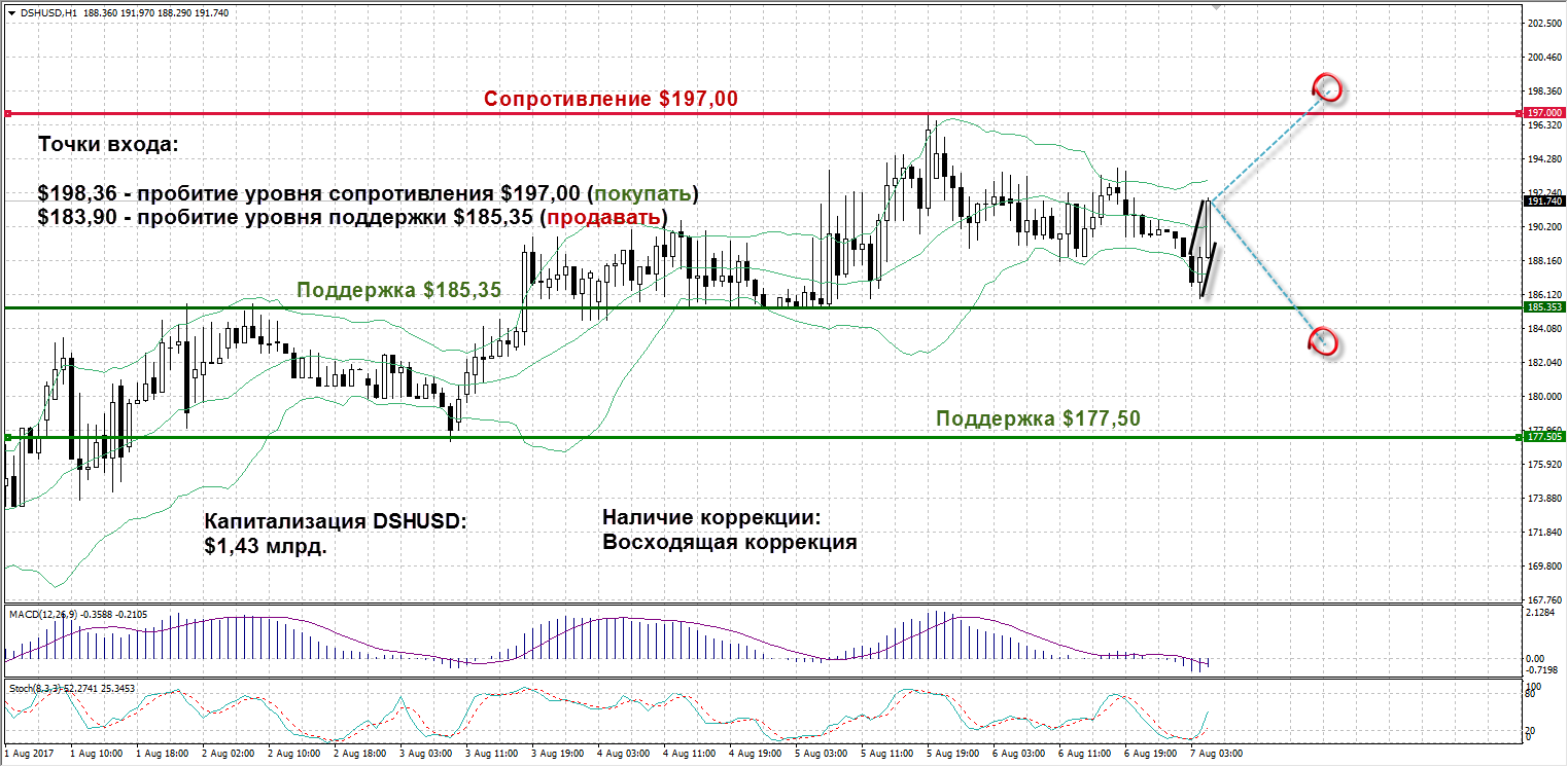 DSHUSD: Дашкоин растет относительно доллара США. Быки направили цену актива к ближайшему локальному максимуму $197,00, в случае пробития которого, рекомендуем покупать DSH с отметки $198,36. Капитализация актива на текущий момент составляет $1,43 млрд. Линия Стохастик находится в нейтральной зоне (52,27%) и направлена к границе зоны перекупленности, а индикатор MACD ниже нулевой отметки при растущих вниз барах, что дает слабый сигнал на продажу. Полосы Боллинджера формируют начало расширения канала волатильности. В случае изменения направления котировок, рекомендуем продавать Дашкоин с отметки $183,90 после удачного тестирования ближайшей поддержки $185,35.