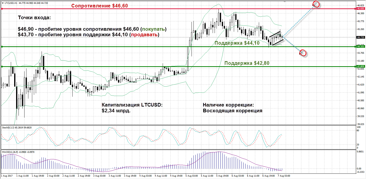LTCUSD: Лайткоин положительно корректируется к доллару США. Быки оттолкнули цену от ближайшей поддержки $44,10 и направили ее к локальному максимуму $46,60, в случае пробития которого, рекомендуем покупать LTC с отметки $46,90. Капитализация финансового инструмента на текущий момент составляет $2,34 млрд. Линия Стохастик расположилась в нейтральной зоне (65,28%) и направлена к границе зоны перекупленности, а индикатор MACD ниже нулевой отметки при растущих вниз барах, что дает слабый сигнал на продажу. Полосы Боллинджера характеризуют умеренную волатильность актива. Если цена возобновит снижение, то рекомендуем продавать LTC с отметки $43,70 после пробития ближайшей поддержки $44,10.