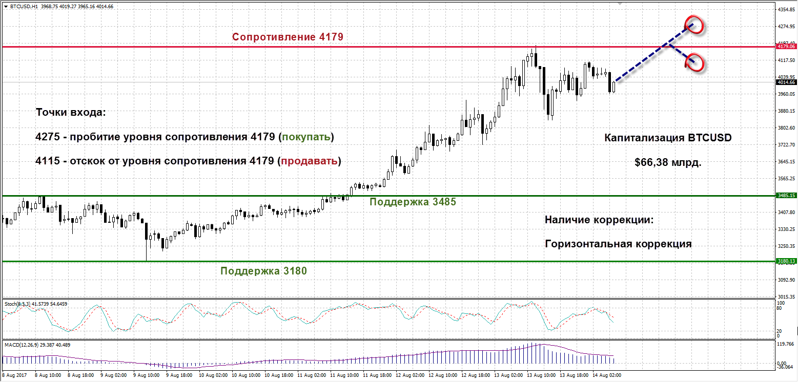 BTCUSD: Биткоин растет впечатляющими темпами. Вопреки прогнозам о снижении стоимости основной криптовалюты после разделения на две отдельные ветви, цена BTC всю прошлую неделю находилась в бычьем тренде. Впервые в истории стоимость Биткоина превысила $4000, а капитализация криптовалюты достигла отметки $66,38 млрд. В данный момент актив консолидируется под уровнем сопротивления 4179. В случае пробития продолжаем набирать лонги в Биткоине по цене от 4275. Сигналом для продаж считаем отскок от сопротивления 4179 и снижение до отметки 4115. Технические индикаторы не подают четких сигналов. Стохастик движется в нейтральной зоне, линия индикатора направлена вниз. MACD чуть снизился во время коррекции.