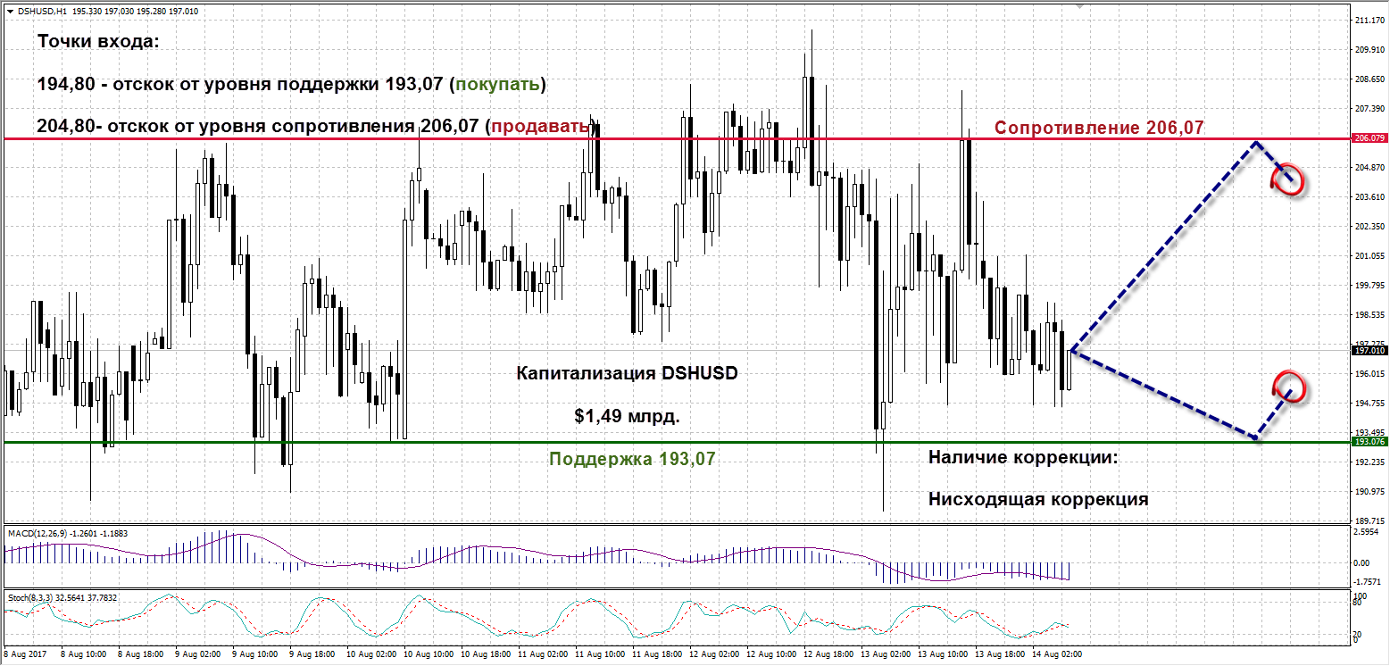 DSHUSD: Дашкоин продолжает движение в широком боковом диапазоне. После тестирования уровня 206,07 актив отрицательно скорректировался почти до уровня поддержки 193,07, который является нижней границей консолидации. При отскоке встаем в лонги по цене от 194,80. В шорты заходим, начиная с отметки 204,8 если цена Дашкоина снова отскочит от уровня сопротивления 206,07. MACD продолжает плавное движение под нулевой отметкой и четких сигналов не подает. Стохастик вышел из зоны перепроданности, это возможный признак начала восходящей коррекции. Капитализация криптовалюты на текущий момент равняется $1,49 млрд.
