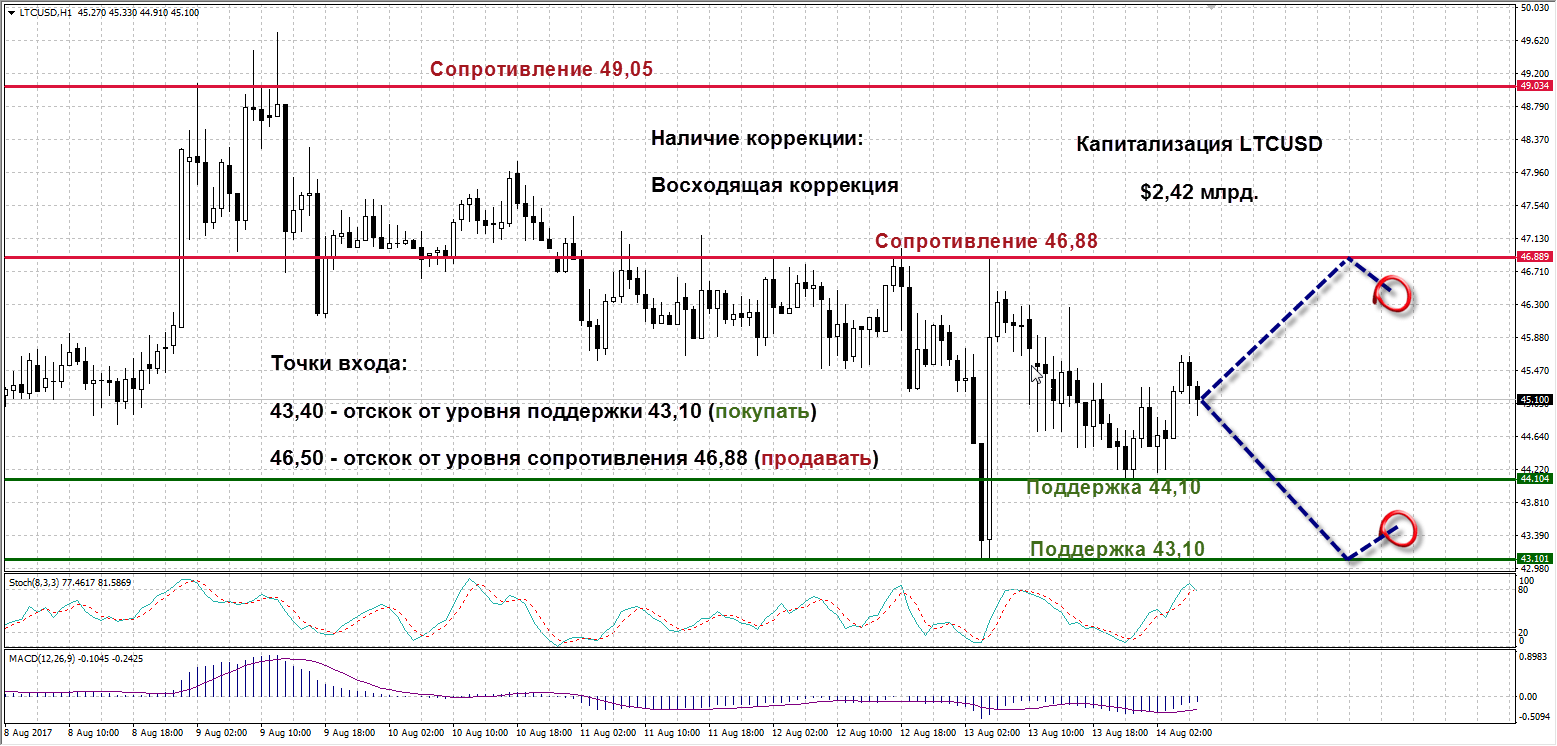 LTCUSD: После пробития вниз уровня 46,88 и многочисленных неудачных попыток снова оказаться над ним Лайткоин расположился над областью поддержки 43,10-44,10. При отскоке от уровня поддержки 43,10 заходим в лонги по цене от 43,40. Ближайший уровень сопротивления 46,88 является достаточно сильным, поэтому на отскоке от него занимаем короткие позиции, начиная с отметки 46,50. Стохастик в зоне перекупленности говорит о том, что цена криптовалюты немного завышена. MACD подрос на восходящей коррекции. Капитализация Лайткоина составляет $2,42 млрд.