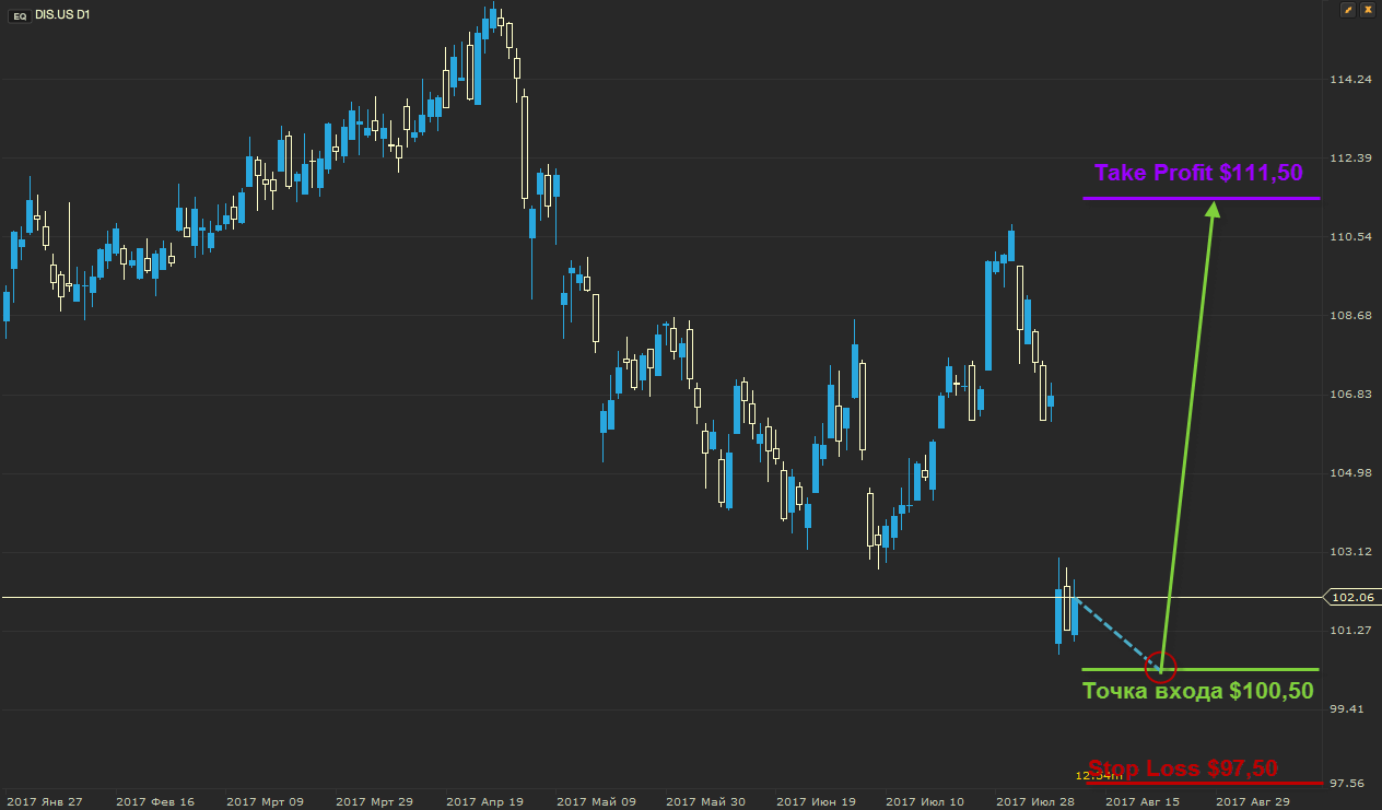 Последние 3 сессии акции компании торгуются в диапазоне $102,98-$100,67 на минимумах впервые с декабря прошлого года. Негативно также на настроения инвесторов повлияли сообщения о том, что Disney собирается запустить свой аналог Netflix, постепенно забирая все собственные фильмы из конкурентного сервиса. Пока участники рынка переваривают эти новости, есть хорошая возможность приобрести подешевевшие акции DIS.US на снижении с $100,50, либо при возврате выше $103 с отметки $103,50. Stop Loss выставим на уровне $97,50, а Take Profit — $111,50.
