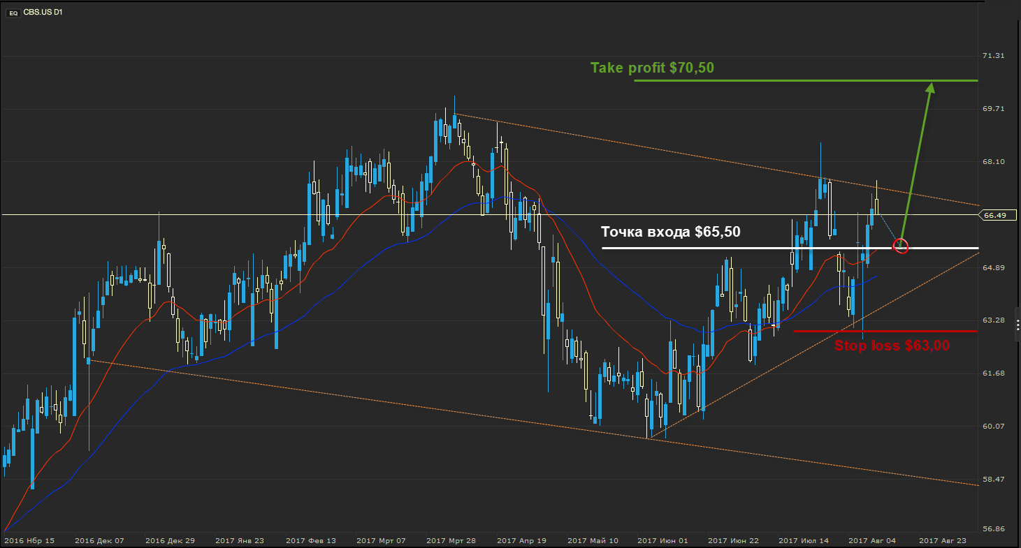После отрицательной коррекции цены акций CBS Corporation до уровня $65,50 откроем длинную позицию. Убытки ограничим на уровне $63,00, а Take profit установим по цене $70,50.