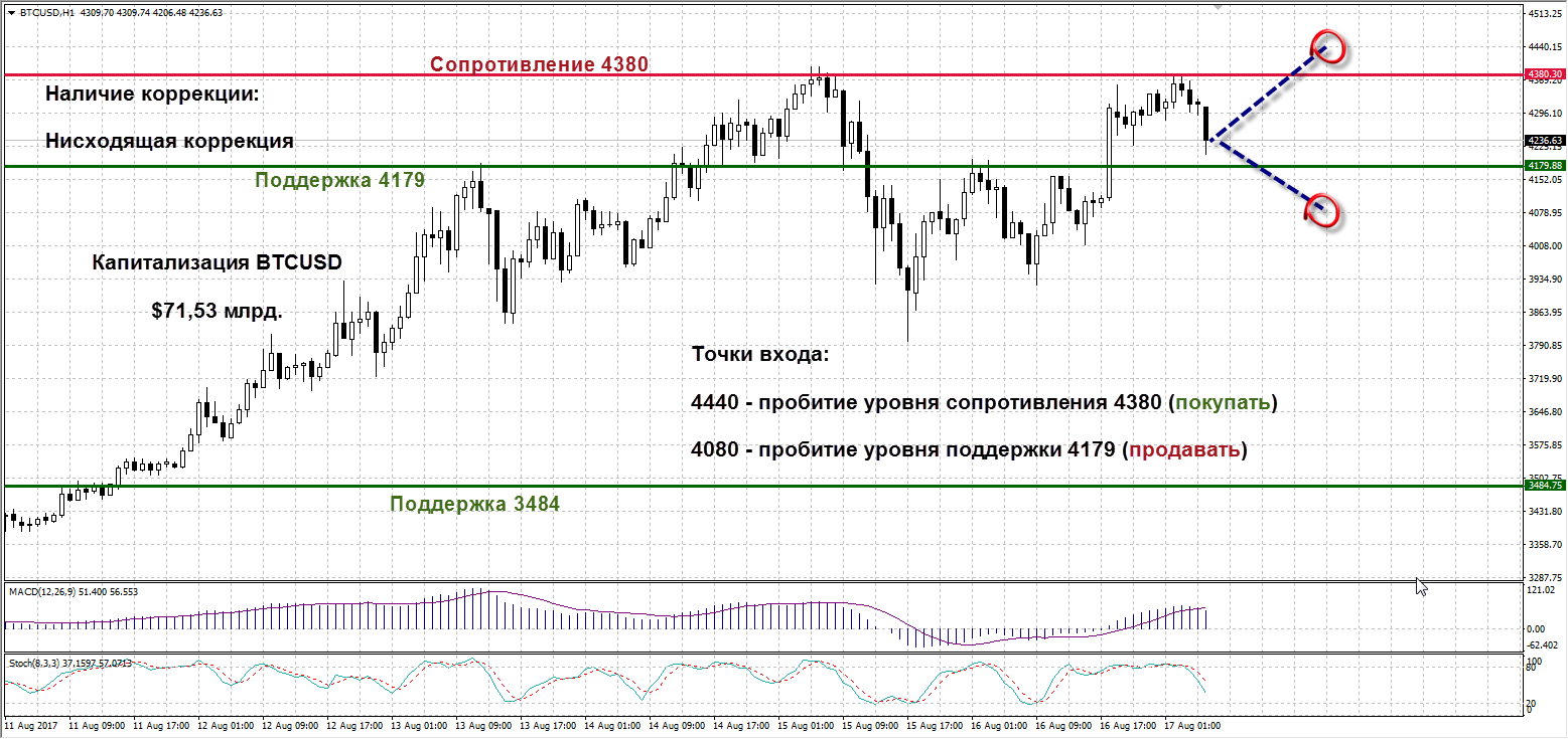 BTCUSD: Биткоин обозначил устойчивое сопротивление на уровне 4380. Возможен разворот с этой отметки, о чем сигнализирует Стохастик на дневном графике. Индикатор очень долго находится в зоне перекупленности, говоря о том, что текущая цена Биткоина явно завышена и необходима коррекция вниз. На часовом графике Стохастику хватило небольшой нисходящей коррекции для того, чтобы выйти из зоны перекупленности в нейтральную зону. MACD вырос на восходящих барах. В случае движения вниз и пробития поддержки 4179 продаем актив по цене от 4080. Если Биткоин продолжит свой рост и пробьет уровень сопротивления 4380, то продолжаем покупки, начиная с отметки 4440. Капитализация актива составляет $71.53 млрд.