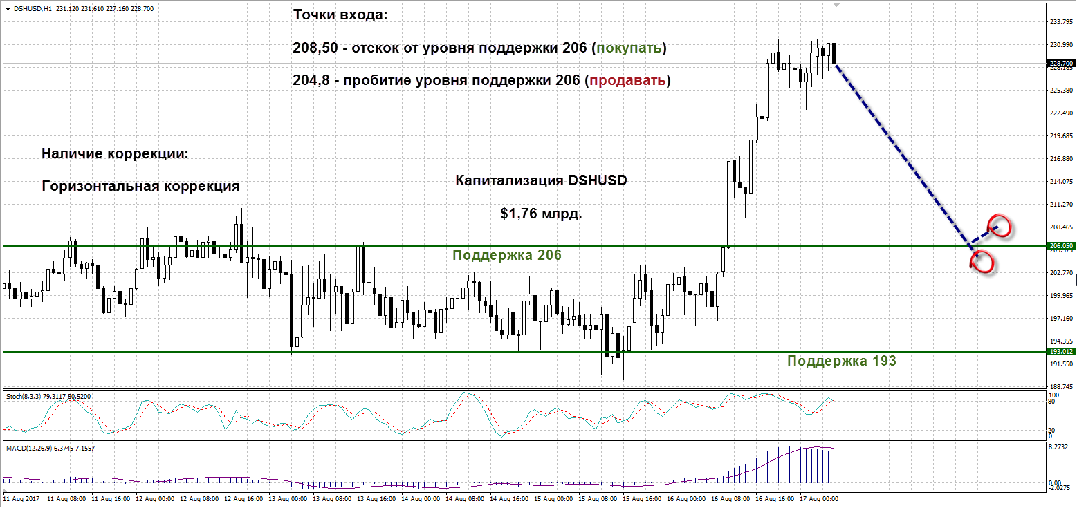 DSHUSD: Набравшись сил во время консолидации в диапазоне 193-206, Дашкоин уверенно выстрелил вверх. MACD, в последнее время не отходивший далеко от нулевой отметки, сильно вырос на восходящих барах. Стохастик проводит много времени в зоне перекупленности, что говорит о завышенной цене Дашкоина. В случае глубокой нисходящей коррекции сильной поддержкой может стать ценовой уровень 206. При отскоке от него заходим в лонги по цене от 208,5. Если же поддержка 206 будет пробита, увеличиваем шорты, начиная с отметки 204,8. Капитализация Дашкоина существенно выросла до отметки $1,76.