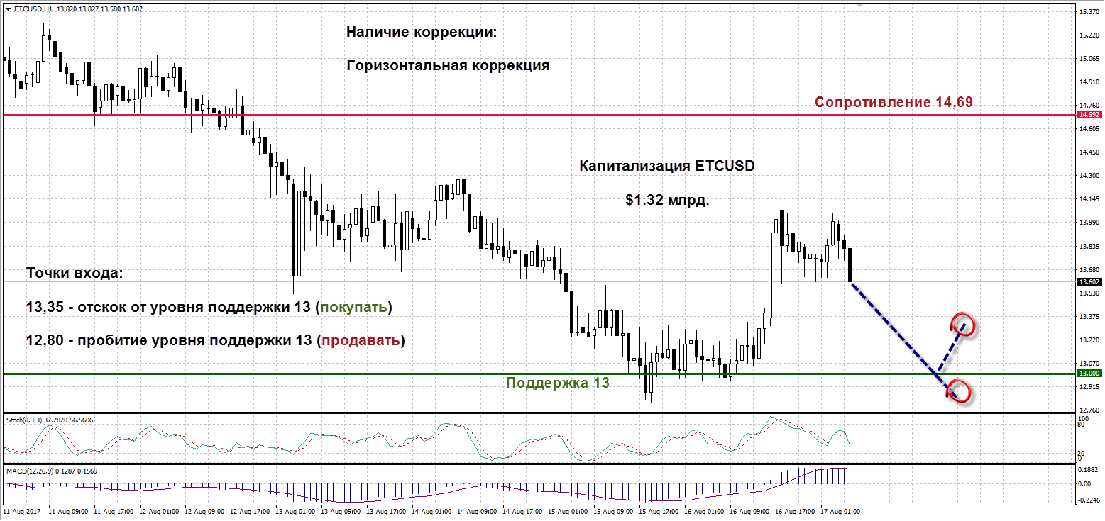 ETCUSD: Классический Эфириум отскочил от поддержки 13, но вскоре начал горизонтальную коррекцию. В случае возврата к поддержке 13 и повторного отскока от нее, заходим в лонги, начиная с отметки 13,35. Если медведям удастся пробить этот значимый уровень, то открываем шорты по цене от 12,80. MACD на фоне разворота актива вверх пробил снизу нулевую отметку и вышел в положительную зону. Стохастик располагается в нейтральной зоне, линия индикатора смотрит вниз. Капитализация классического Эфира увеличилась до $1.32 млрд., но по сравнению с остальными криптовалютами это по-прежнему скромный результат.