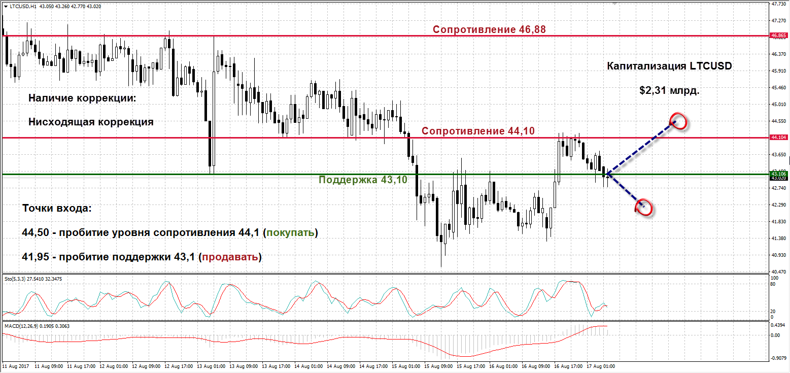 LTCUSD: Лайткоин вернулся в диапазон 43,10-44,10, отрицательно скорректировавшись от сопротивления 44,10. Если этот уровень пробьют вверх, заходим в лонги по цене от 44,50. Короткие позиции занимаем в случае пробития уровня поддержки 43,10, начиная с отметки 41,95. Стохастик вышел из зоны перепроданности, говоря о том, что цена актива стала более адекватной. MACD немного снизился на нисходящей коррекции. Капитализация Лайткоина немного подросла, составив $2,31 млрд.