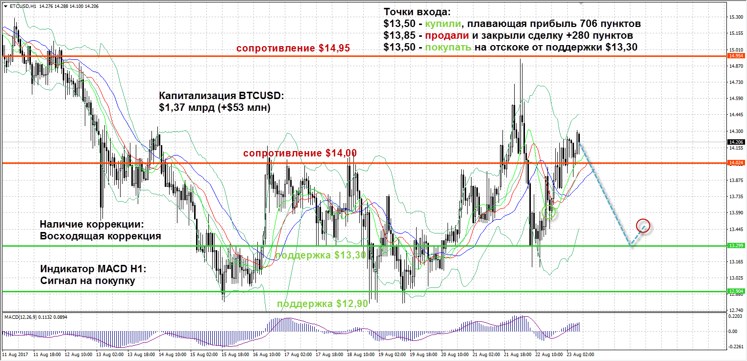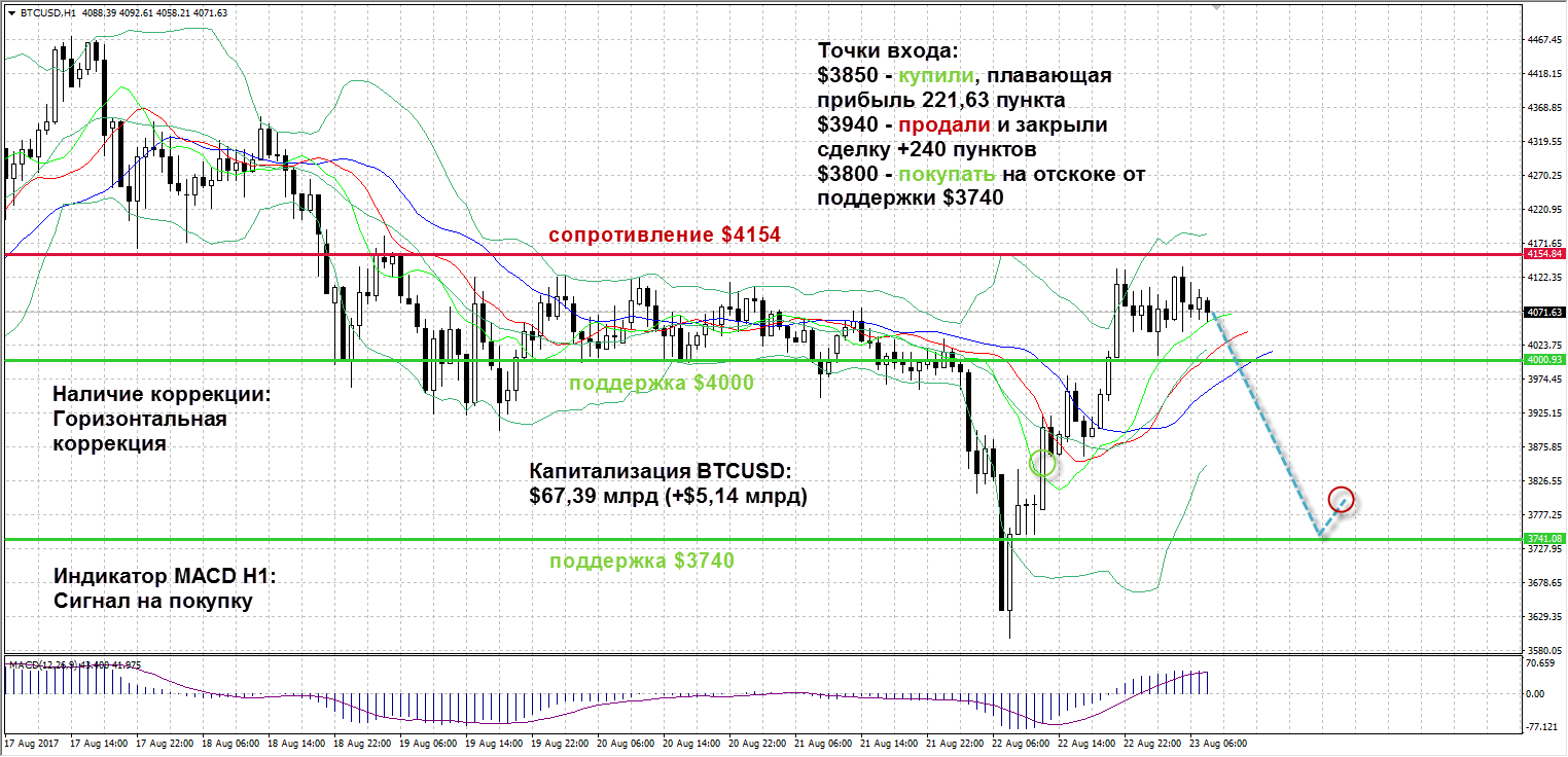 Столь мощная коррекция вниз на прошедших торгах была связана появившимися сообщениями о том, что активация SegWit была перенесена из-за снижения хешрейта биткоина, переходом многих майнеров к более прибыльной добыче Bitcoin Cash на данном этапе, ростом количества неподтвержденных транзакций в сети до двухмесячного максимума, из-за чего сработал «эффект толпы», сбрасывающей основную криптовалюту. Тем не менее, к концу сессии BTCUSD восстановился, что указывает лишь на краткосрочную реакцию в ответ на технические проблемы криптовалюты. Сегодня ожидается активация SegWit примерно в 18:30, из-за чего следует быть предельно осторожным при торговле в это время. Наиболее актульной торговой идеей остается покупка BTCUSD на спадах и сохранение текущей длинной позиции.