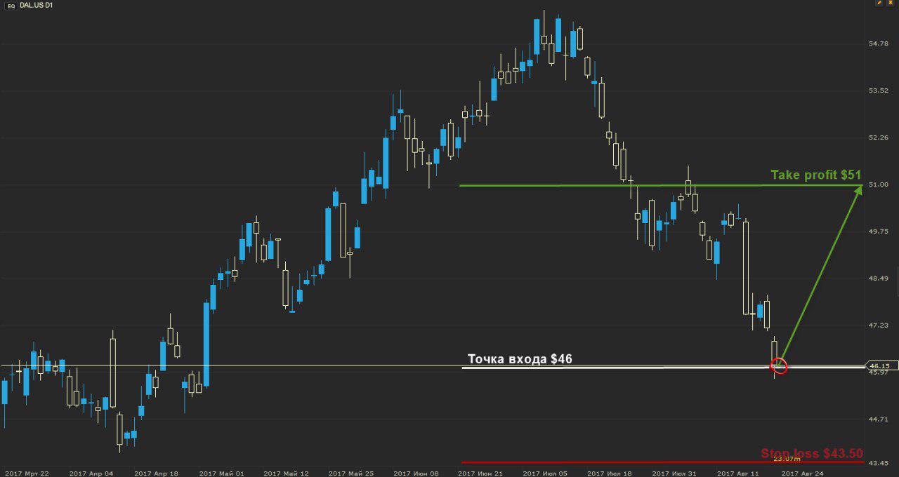 Таким образом, рекомендуем занять длинные позиции по акциям Delta Air Lines, Inc. (DAL.US) по цене от $46. Stop loss установим на отметке $43,50. Прибыль фиксируем по частям, начиная с уровня $51.