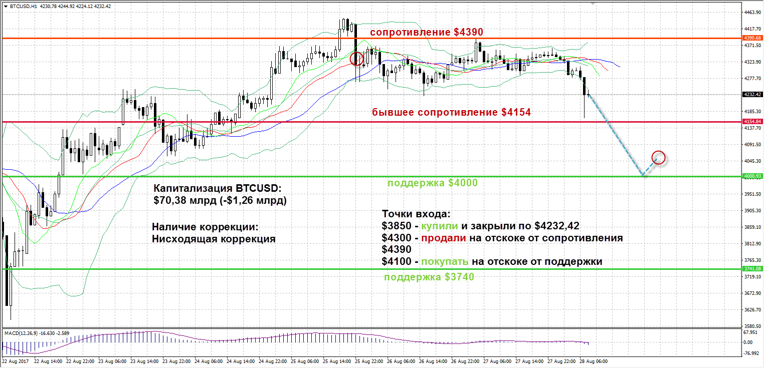 Поддержку курсу с четверга оказывает новость о запуске протокола SegWit, первый блок с которым был найден китайским майнинговым пулом, однако после неудачных попыток закрепиться выше сопротивления курс BTCUSD консолидировался в области $4350, однако затем трейдеры начали отыгрывать новости о деанонимизации биткоина. Согласно которым, налоговая служба США еще с 2015 года с помощью специальных инструментов имеет возможность деанонимизировать транзакции в сети главной криптовалюты.