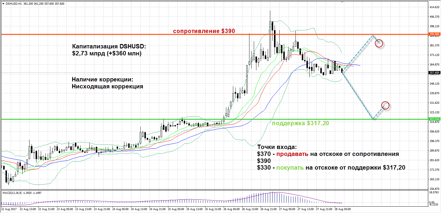 Вчера был обновлен исторический максимум до $411,70, а капитализация DSHUSD с пятницы выросла на $390 млн до $2,73 млрд. После столь мощного всплеска вполне ожидаема нисходящая коррекция, однако на отскоке от $317,20 мы возобновим покупки. Продавать рекомендуется на отскоке от $390.