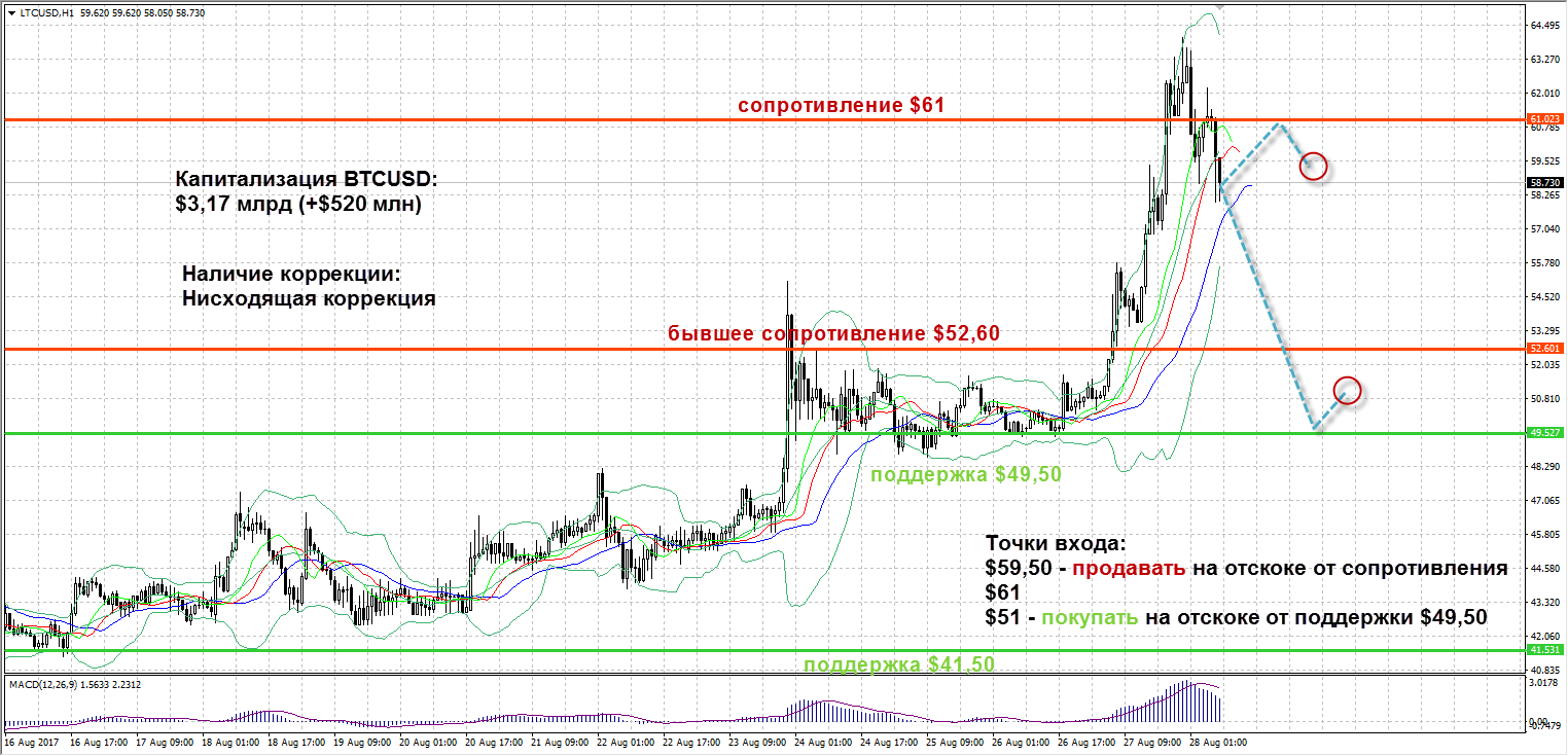 LTCUSD: Вчера курс LTCUSD обновил исторический максимум, впервые преодолев $60 отметку и достигнув $64,07. Основной рост пришелся именно на воскресение после 4 сессий консолидации в узком диапазоне $49-$52. Сигналы на продажу так и не были активированы, капитализация выросла с пятницы на $520 млн до $3,17 млрд. На текущий момент курс LTCUSD корректируется вниз, однако продажи стоит открывать лишь на отскоке от $61,00. Учитывая стабильность Litecoin, высокую пропускную способность сети, а также более конкурентные уровни комиссий, данная криптовалюта может стать отличным вариантом для инвестиций в условиях повышенной волатильности. Покупать рекомендуется на отскоке от $49,50 с $51,00.