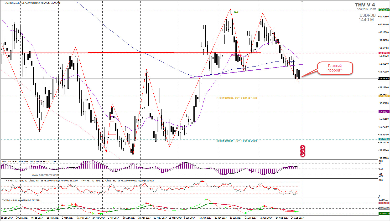 В любом случае сейчас можно рассматривать возможность продаж пары, но если курс «вдруг» начнет расти, и сумеет закрепиться выше 59, то следует покупать USDRUB с вышеуказанными целями на 61 – 62, в особенности, если это движение будет подтверждено снижением нефти.