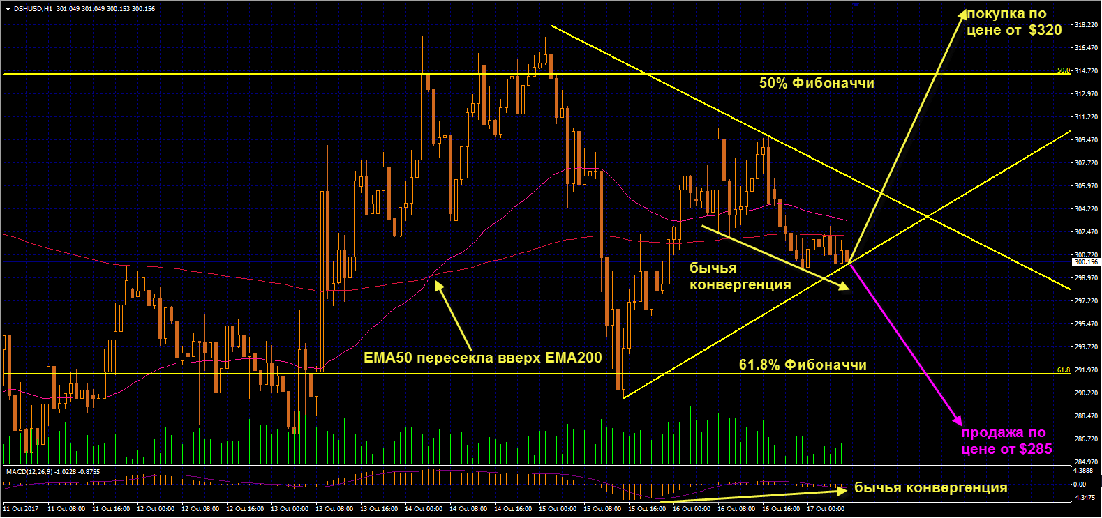 DSHUSD: Коррекция в Дашкоине сужается, образовав клин. Если криптовалюта пробьет фигуру вверх и закрепится над уровнем 50% Фибоначчи, покупаем Дашкоин, начиная с отметки $320. На вероятность восходящего движения указывает индикатор MACD, образовавший бычью конвергенцию. В шорты заходим, начиная с отметки $285, если будет пробит вниз уровень 61,8% Фибоначчи.