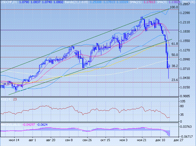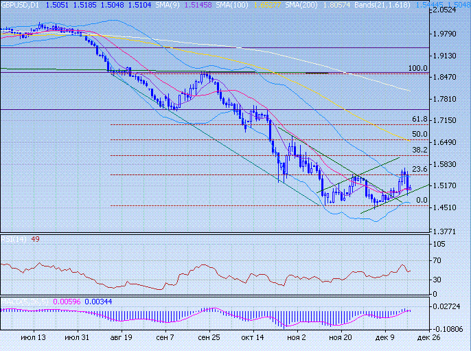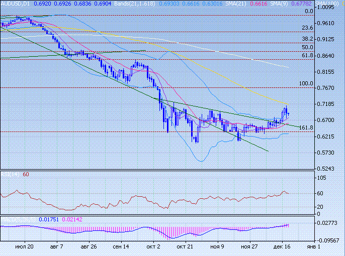 Стерлингу не удалось удержаться на 23,6% Фибоначчи и он снизился к поддержкам 9 МА и 21 МА. Торговля ведется в середине полосы Боллинжера, ситуация нейтральна. Следующая неделя станет рождественской и, вероятно, валюты будут консолидироваться в узких диапазонах вблизи текущих отметок. Краткосрочная повышательная поддержка проходит по 1,4965. Модель двойное основание расформирована.