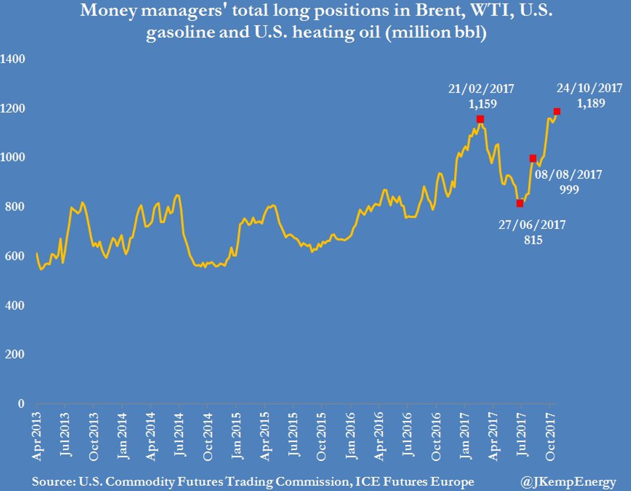 Их чистая длинная позиция в пяти основных контрактах (Brent, WTI, RBOB, HO) сейчас составляет рекордные 1,189 млрд баррелей. Когда все делают ставку в одну сторону, рынок не может продолжать расти: обычно происходит разворот.