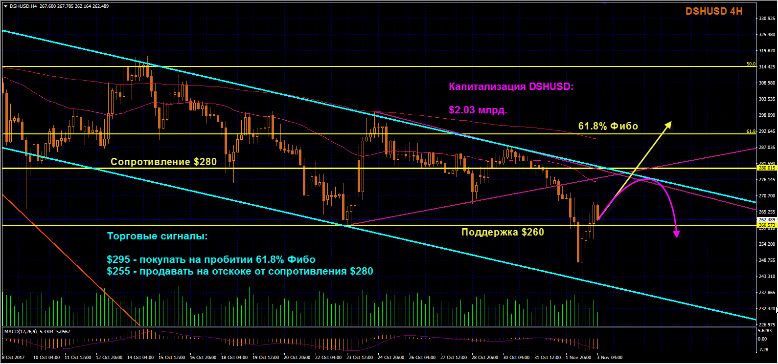 DSHUSD: Медведи Дашкоина смогли пробить поддержку $260, но закрепиться под ней с первого раза не удалось. Цена DSHUSD отскочила от нижней границы тренда и корректируется к сопротивлению $280. Если Дашкоин пробьет этот уровень и закрепится над 61,8% Фибоначчи, заходим в лонги по цене от $295. В случае очередного отскока от верхней границы нисходящего ценового канала дожидаемся возвращения цены под поддержку $260 и продаем актив, начиная с отметки $255.