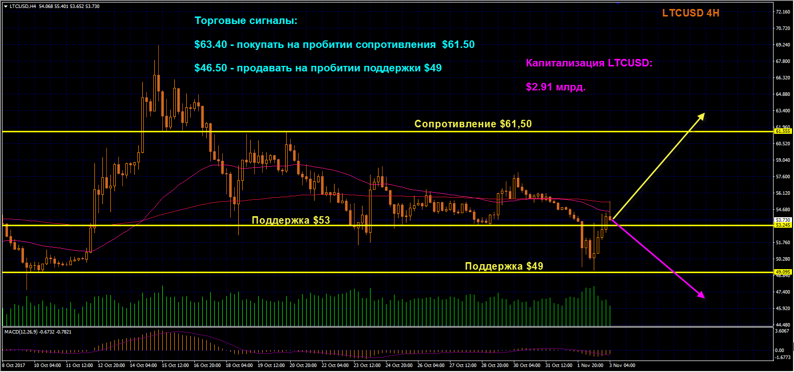LTCUSD: Выйдя из боковика, Лайткоин протестировал поддержку $49 и отскочил от нее, вернувшись в боковик над уровнем $53. Сопротивлением дальнейшему росту стали скользящие средние. ЕМА50 при этом пересекла сверху вниз ЕМА200, подав сигнал к продажам. Если на ретесте уровень поддержки $49 будет пробит вниз, продаем Лайткоин, начиная с отметки $46,50. В лонги входим по цене от $63,40, после того как Лайткоин выйдет из горизонтальной консолидации вверх и закрепится над сопротивлением $61,50.