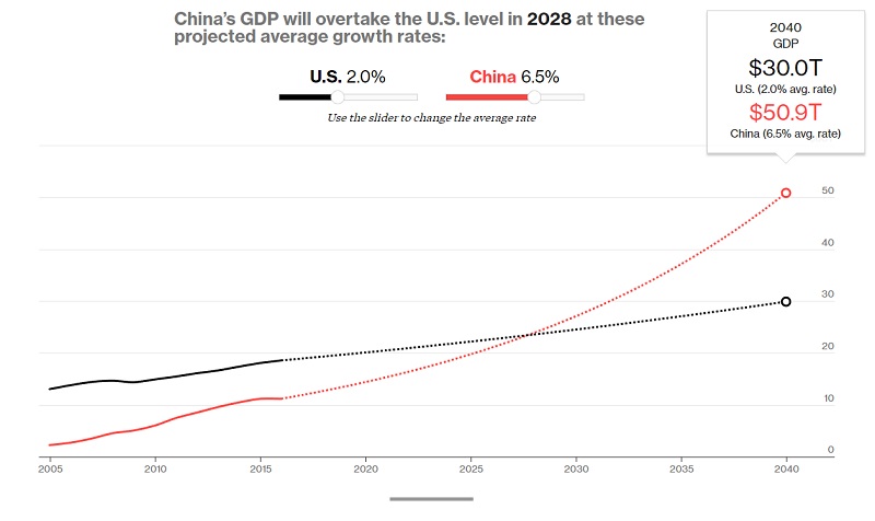 Китай растет и формирует все большую часть глобальной экономики. Однако же это не в полной мере происходит за счет США, Китай также подавляет Европу и Японию. Согласно последним оценкам МВФ, Китай внесет более трети в глобальный рост в этом году.