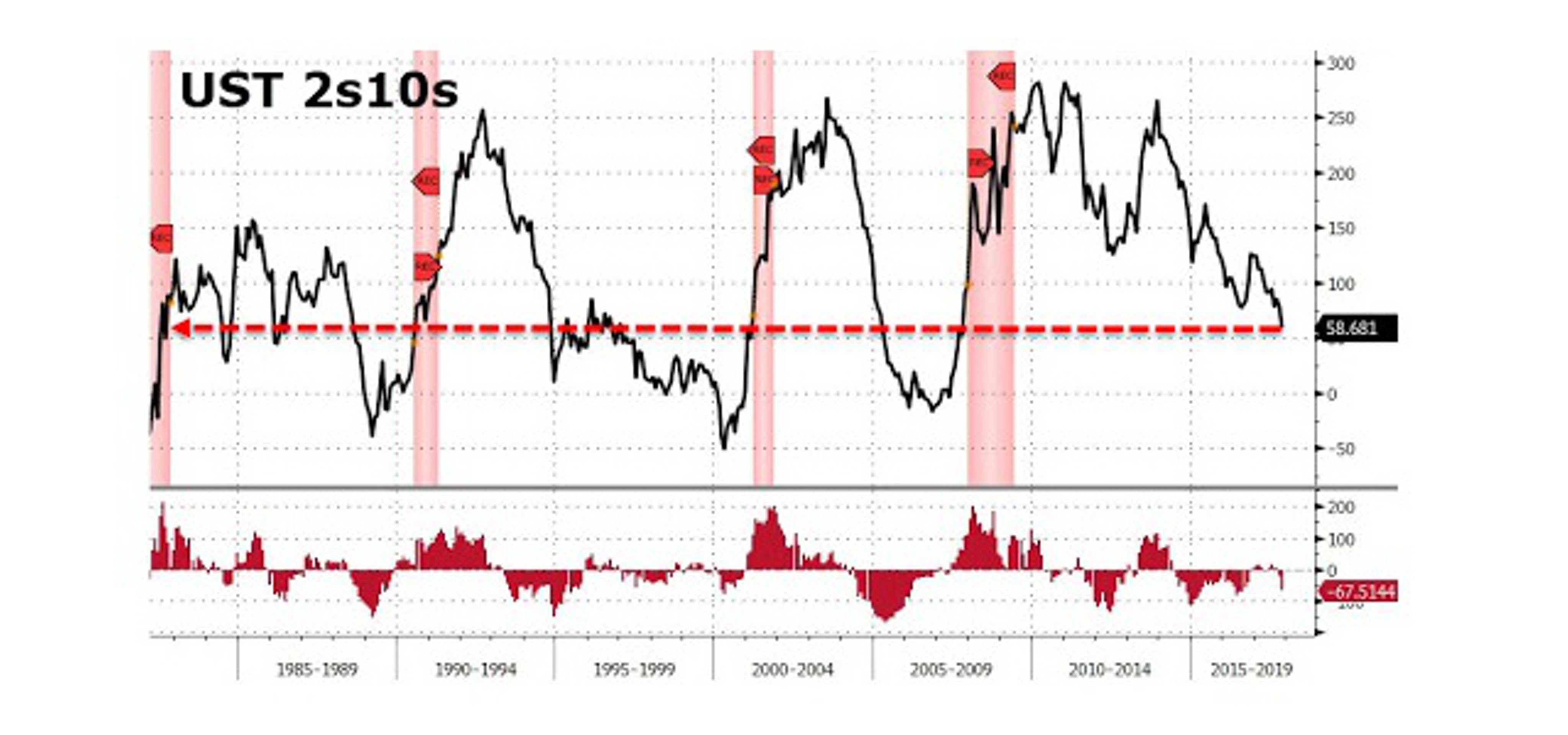 Разница доходностей между 10- и 2-летними трежерис составляет всего 60 пунктов. Судя по динамике, эта разница достигнет нуля или станет отрицательной совсем скоро.