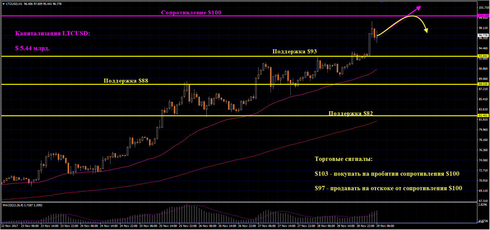 LTCUSD: Лайткоин растет в плавном восходящем тренде, приближается тестирование психологического сопротивления $100. В случае пробития этого ключевого уровня наращиваем лонги в монете, начиная с отметки $103. Вполне вероятно, что с первой попытки сопротивление $100 пробить не удастся, а отскок приведет к глубокой коррекции. В таком случае открываем короткие позиции по цене от $97.